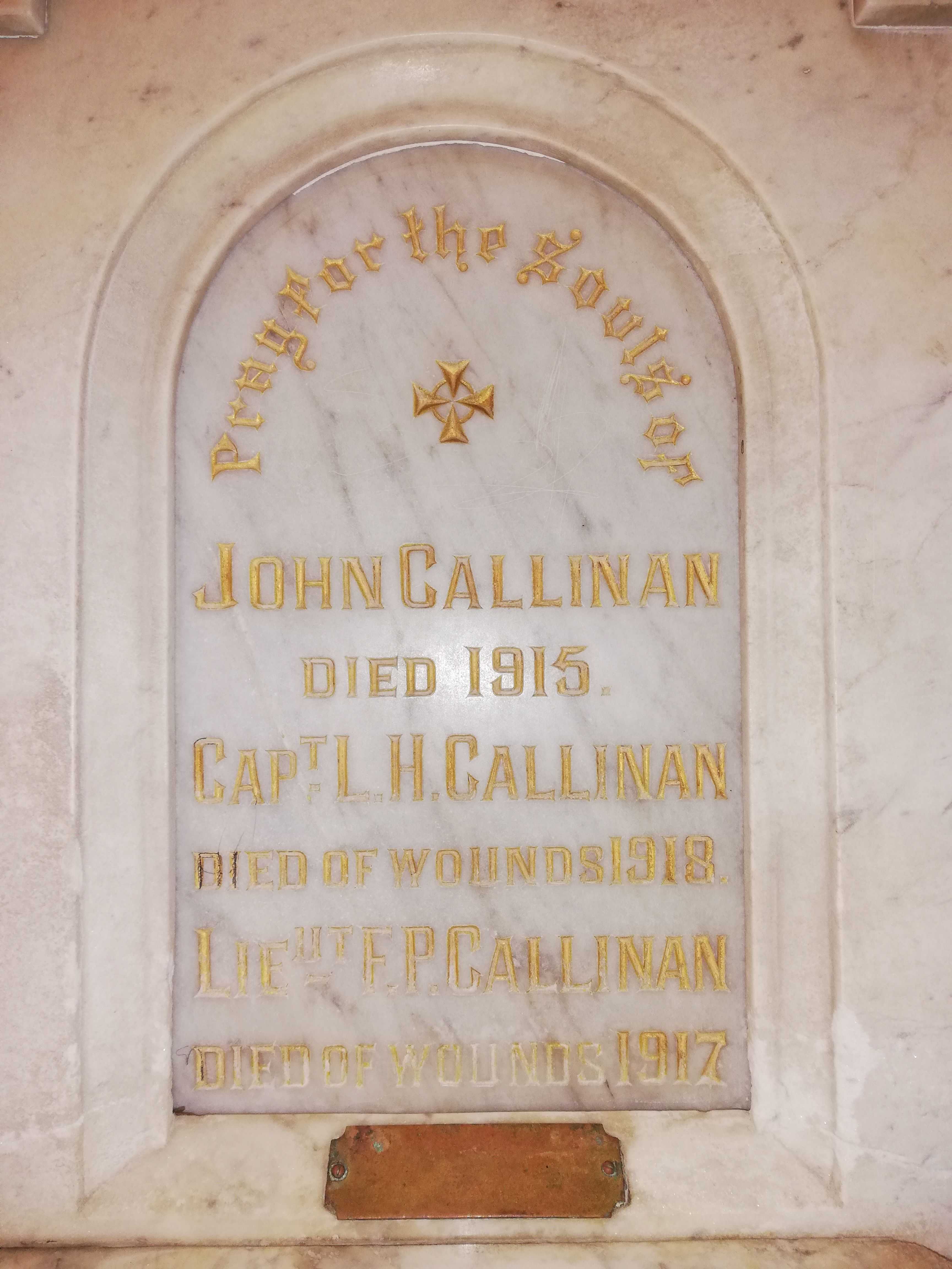 Frank’s older brother, Capt. Laurence Hurley Callinan, born 07.05.1894 in Ballarat was also single and a clerk. He enlisted to the British Army in 1915 and as a sergeant, embarked H.M.A.T A71 Nestor to Egypt. He was promoted to Lieutenant on 12.03.1916 and transferred on 16.06.1916 to 24th Field Artillery Brigade in France and also served in Belgium in 1917. On 31.01.1918 he was detached to the artillery school in England. Returning to France to the 3rd Artillery Brigade, he was wounded from gas and died from its poisoning on 09.09.1918 at the 8th General Hospital in Rouen. His Funeral was conducted on 10.09.1918 by Rev E Kelly at the Saint-Sever military cemetery, France. Mary endured a great deal of grief over the previous four years. Her husband, John Callinan was a miner at the Young Sulieman mine in Ballarat East and then a clerk with the Way and Works Branch of the Victorian Railways when he died. He had a miraculous escape as a miner, when in a shaft 257 ft. below ground he went to the aid of a Michael Callinan whose ankle was jammed in the bucket tail rope as the engine began to haul it up. John’s wrist also got jammed and they were both hauled to the surface, Michael head down! When the braceman heard one of them call out, he stopped the engine, suspending them within 50 ft. of the surface and as the newspaper reported, and “prolonging their agonies”. Realising the state of affairs, they were hoisted to the surface and suffered only “very slight injuries”. He is shown on the font as having died in 1915 but in fact his death was registered in 1914. The funeral left his residence at 105 Church St, Richmond and was buried in the Coburg General Cemetery on 30.10.1914. Frank and Laurence also had two sisters, Eileen and Molly.
